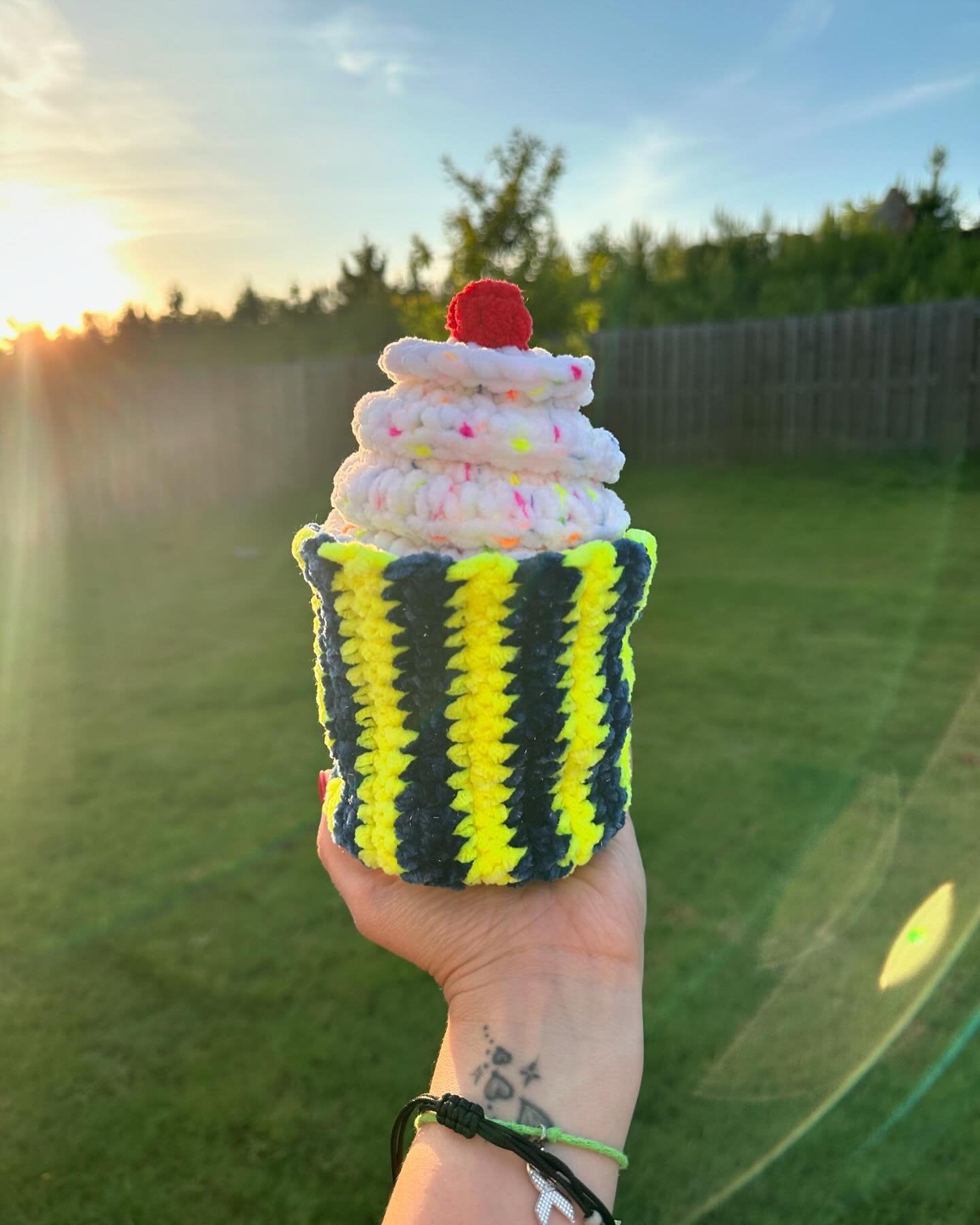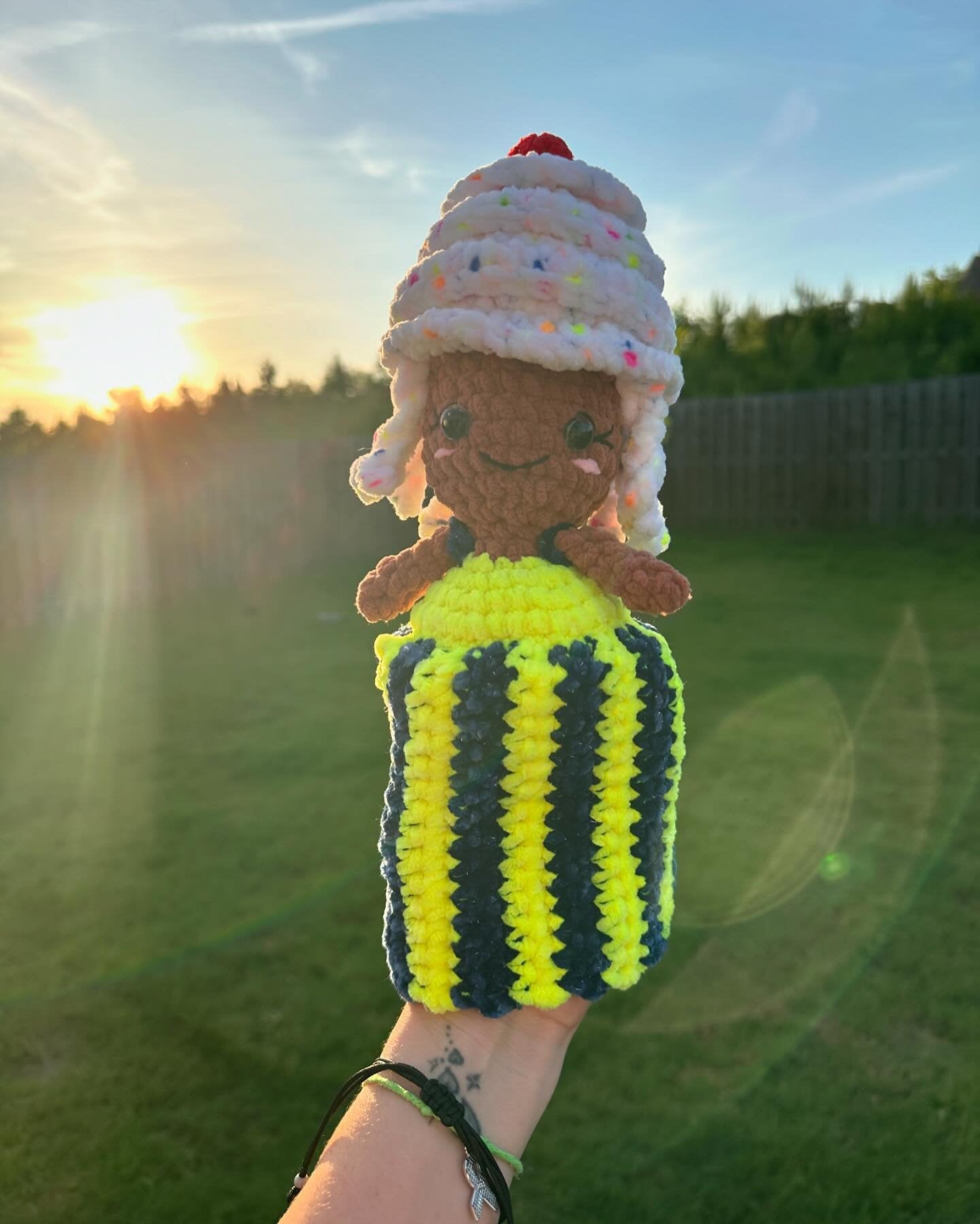 Nothing like a super soft cupcake doll to play and carry around. She stands about 12 inches high and when folded up into her cupcake form she is about 7.5 inches high. Please keep in mind that safety eyes are always a choking hazard. The pattern I used to crochet this cutie is by Claire the Crochet Lady